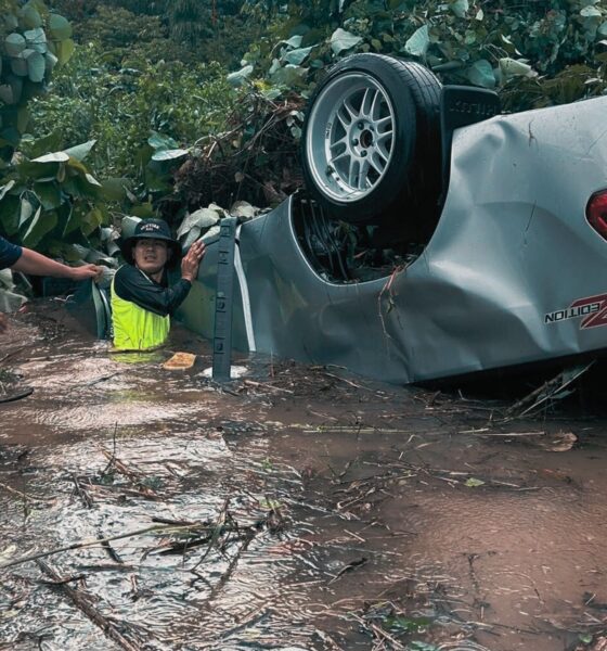นาทีชีวิต กู้ภัยช่วยเหลือคนขับรถจมน้ำ หลังลื่นน้ำท่วมจมน้ำ