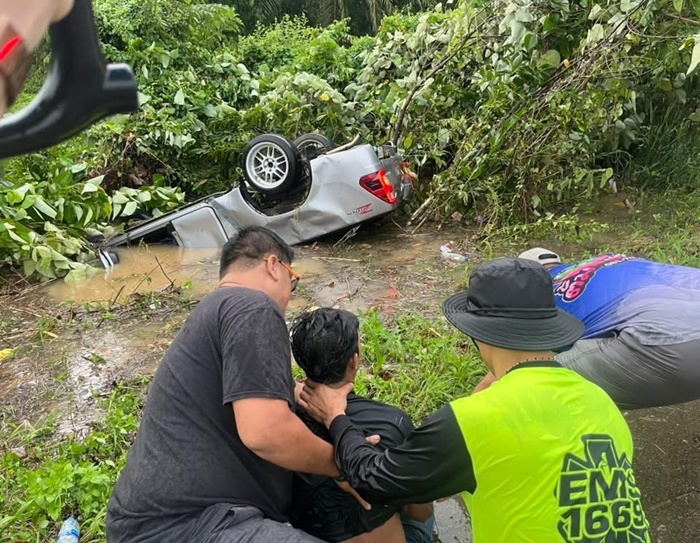 เบื้องต้นภายในรถพบผู้บาดเจ็บ 2 ราย ทั้งคู่เป็นแม่ลูกกัน ผู้โดยสารชื่อนางสาวจุรีภรณ์ อายุ 46 ปี ออกมาจากรถด้วยตนเอง ปลอดภัยไม่ได้รับบาดเจ็บมากนัก ส่วนคนขับชื่อนายพีรพล อายุ 24 ปี ติดอยู่ภายใน อาสาต้องดำน้ำเข้าช่วยเหลือออกจากรถ พบว่าไม่มีชีพจร ต้องปั๊มหัวใจช่วยเหลือจนกลับมามีชีพจรได้สำเร็จ พร้อมประสานรถกู้ชีพ รพ.เขาสมิง เดินทางรับนายพีรพล ในที่เกิดเหตุ