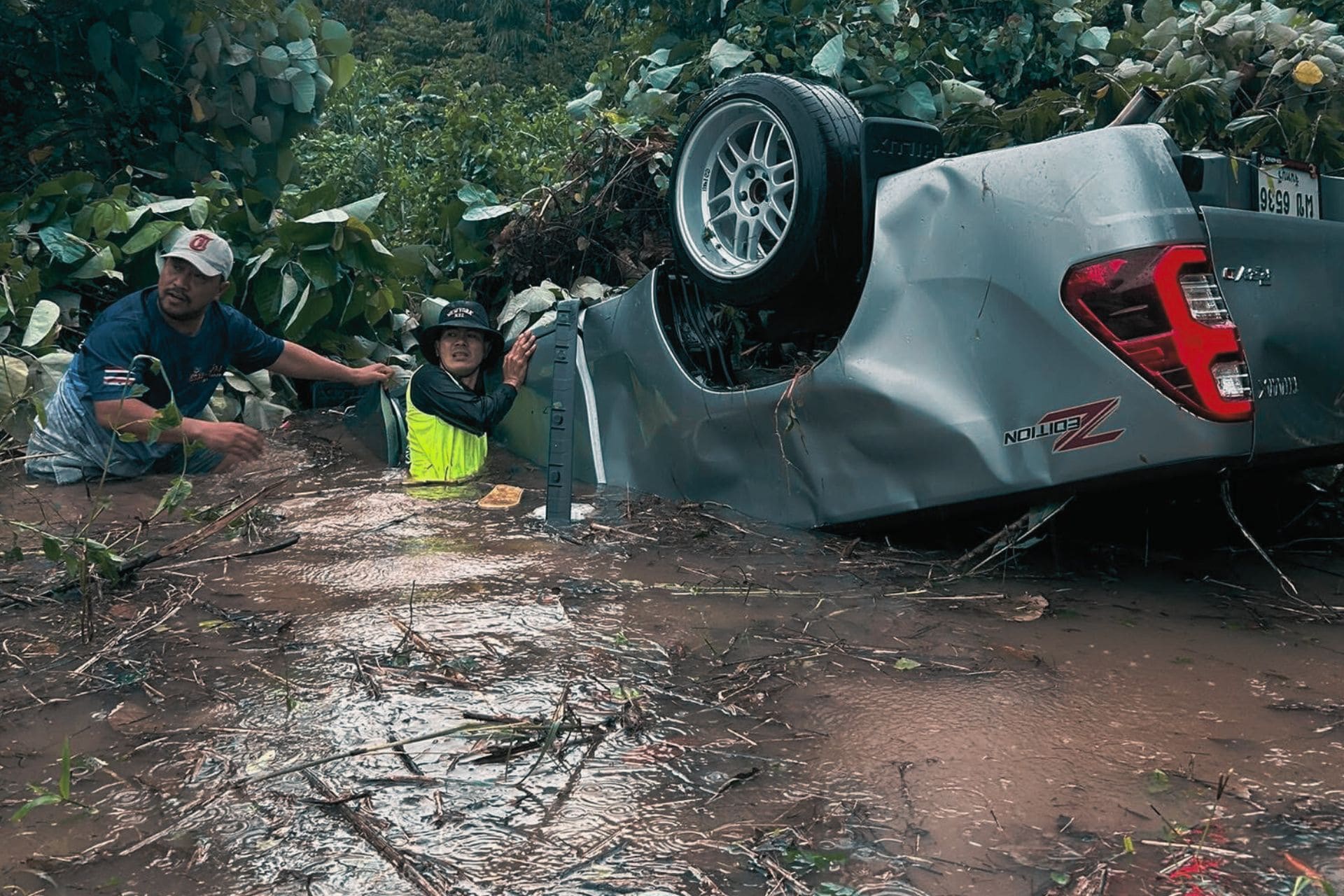 นาทีชีวิต กู้ภัยช่วยเหลือคนขับรถจมน้ำ หลังลื่นน้ำท่วมจมน้ำ