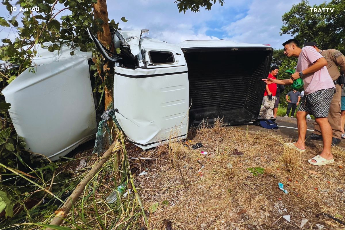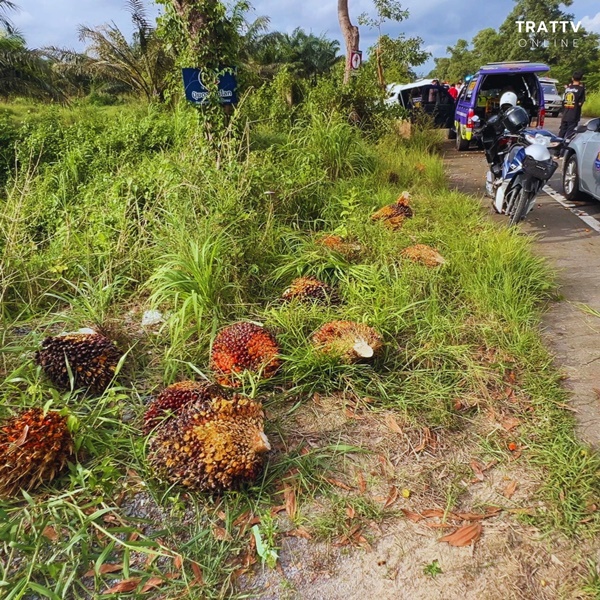 ในที่เกิดเหตุพบรถยนต์กระบะ อีซูซุ แคปสีขาว พลิกตะแคงชนกับต้นไม้ริมทาง ทำให้ทะลายปาล์มที่บรรทุกมาตกเกลื่อนถนน คนขับเป็นชาย อายุ 54 ปี รู้สึกตัวดี แต่ขาทั้ง 2 ข้าง ถูกอัดก็อปปี้กับซากรถ อาสากู้ภัยต้องใช้เครื่องตัดถ่างเข้าช่วยเหลือ นานกว่า 30 นาที จึงสามารถนำตัวผู้บาดเจ็บออกจากรถได้ โดยมีรถกู้ชีพโรงพยาบาลกรุงเทพตราด เดินทางมารับผู้บาดเจ็บในที่เกิดเหตุ ท่ามกลางชาวบ้านที่มุงดูเหตุการณ์จำนวนมาก