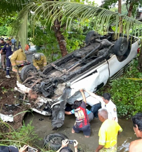 กระบะลื่นน้ำบนถนน เสียหลักพลิกคว่ำบาดเจ็บ 4 ราย โชคดีกู้ภัยช่วยเหลือปลอดภัย แต่โชคร้ายถูกตำรวจจับ เพราะเจอยาในรถ